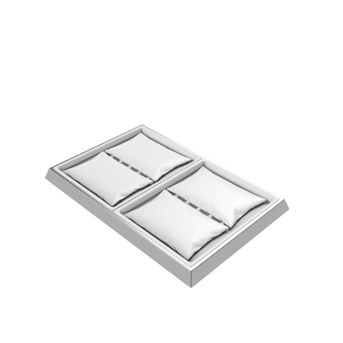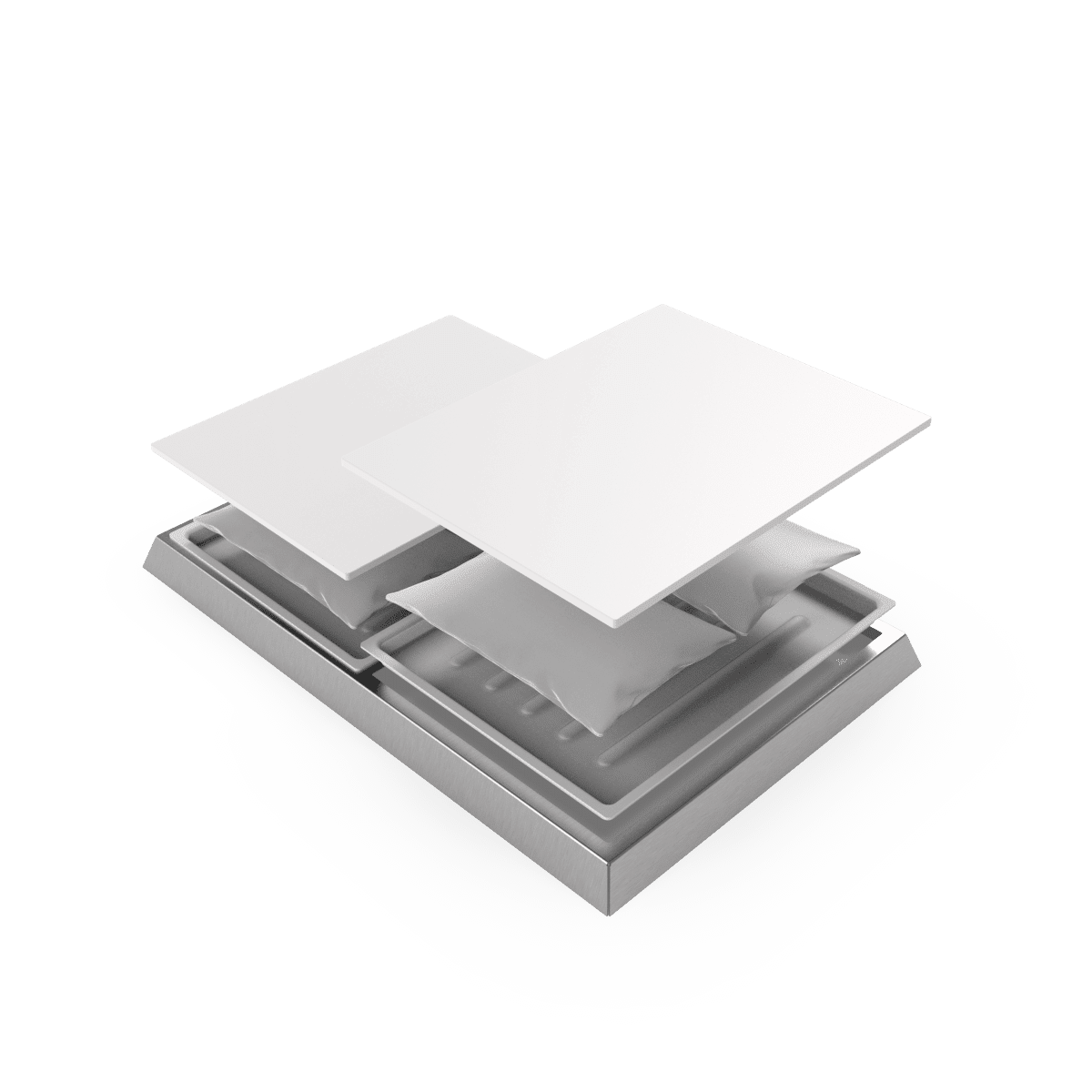 Base de acero inoxidable esmerilado, bandeja plástica, placa de Karikal y refrigerante (gel en bolsas plásticas).