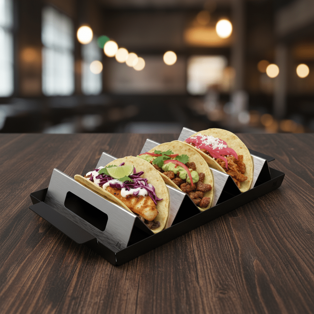 Portatacos de Acero Inoxidable con capacidad para 3 tacos.