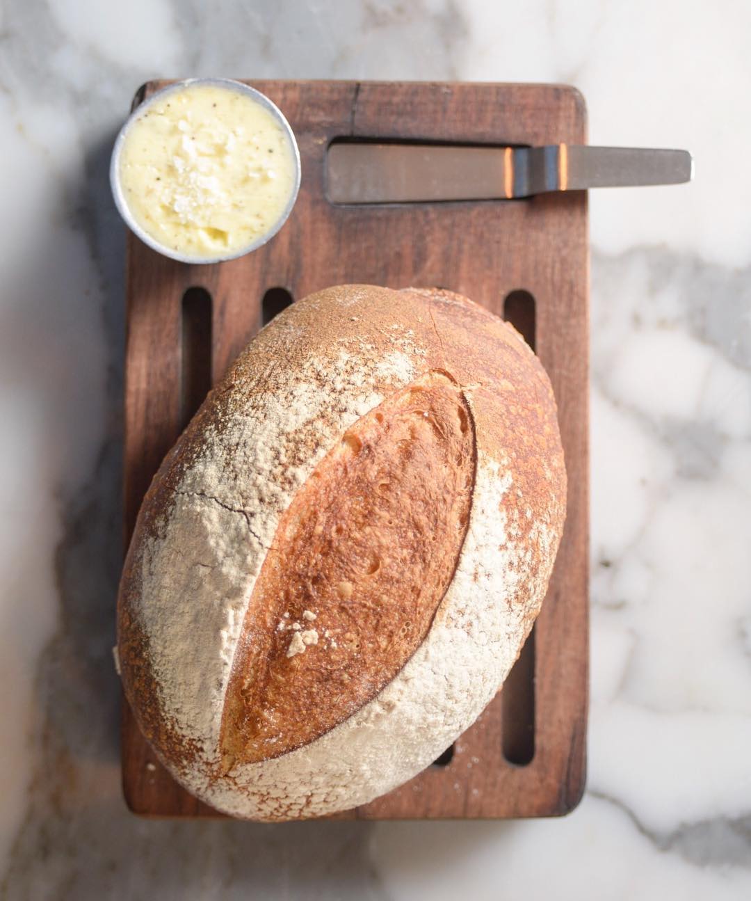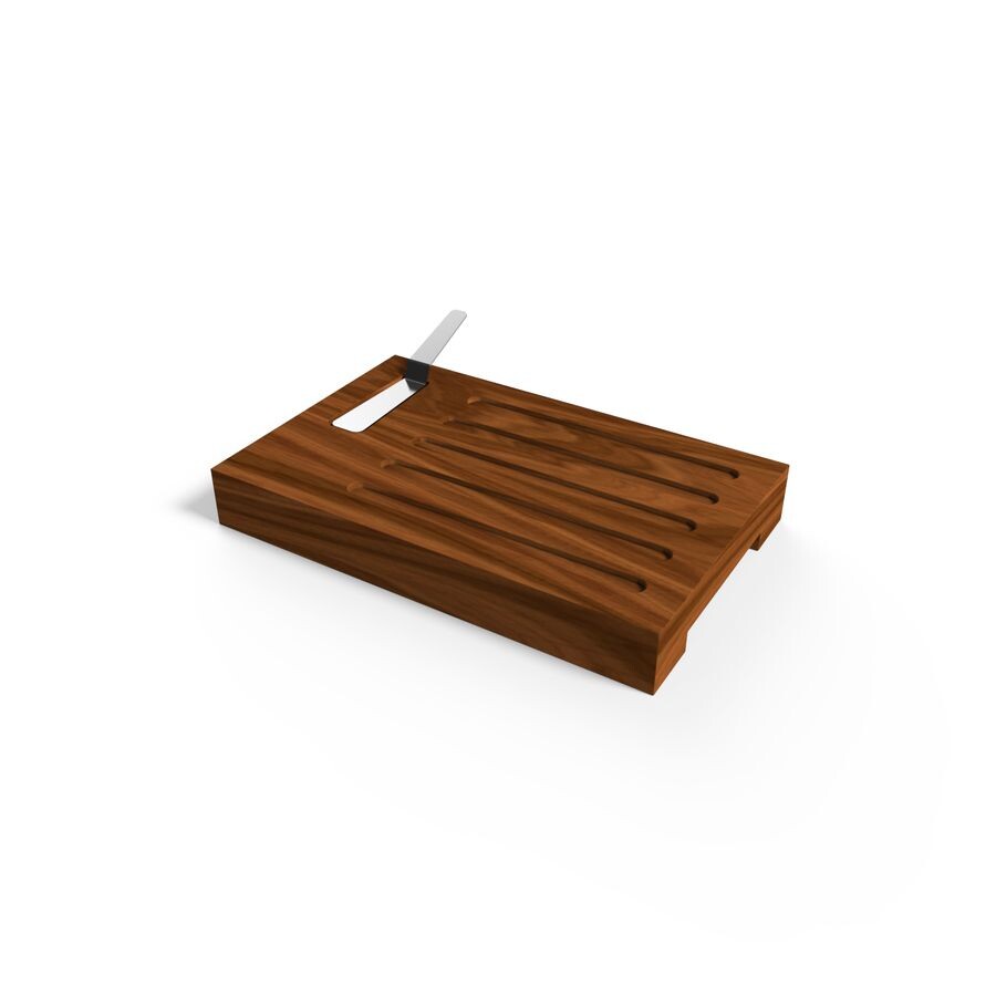 Tabla realizada en madera con ranuras ideal para servir pan con alguna salsa o condimento en el espacio destinado para un dip.