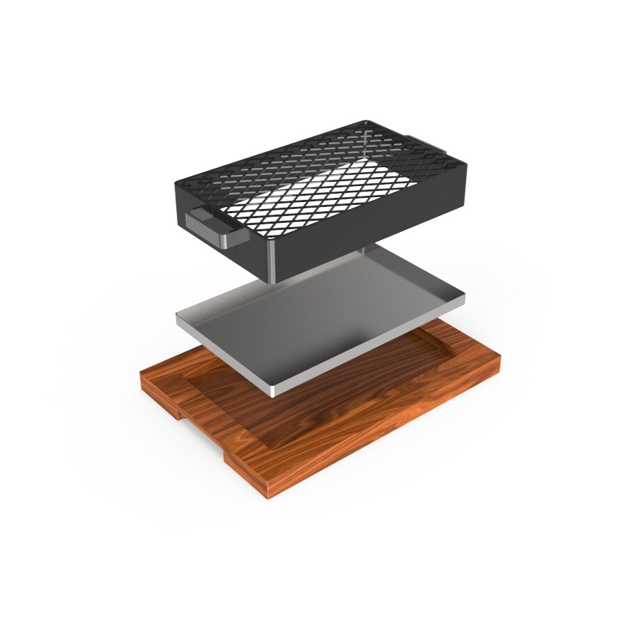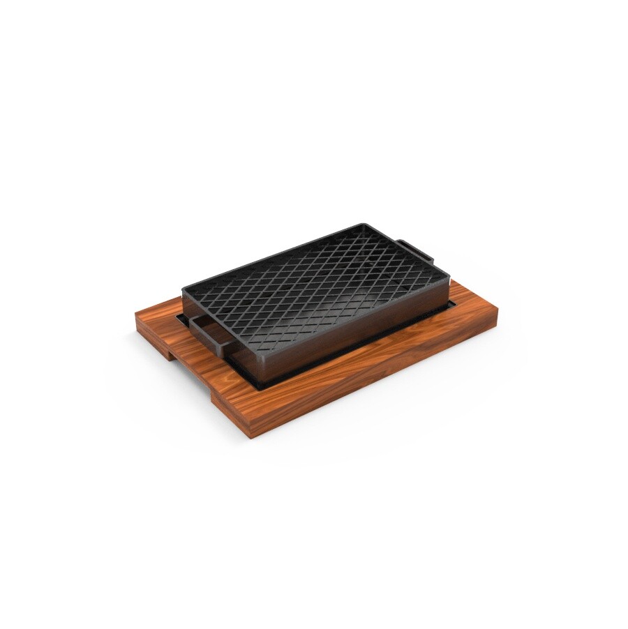 Compuesta, por una tabla de madera, una base para jugos y una grilla que se puede usar de ambos lados.