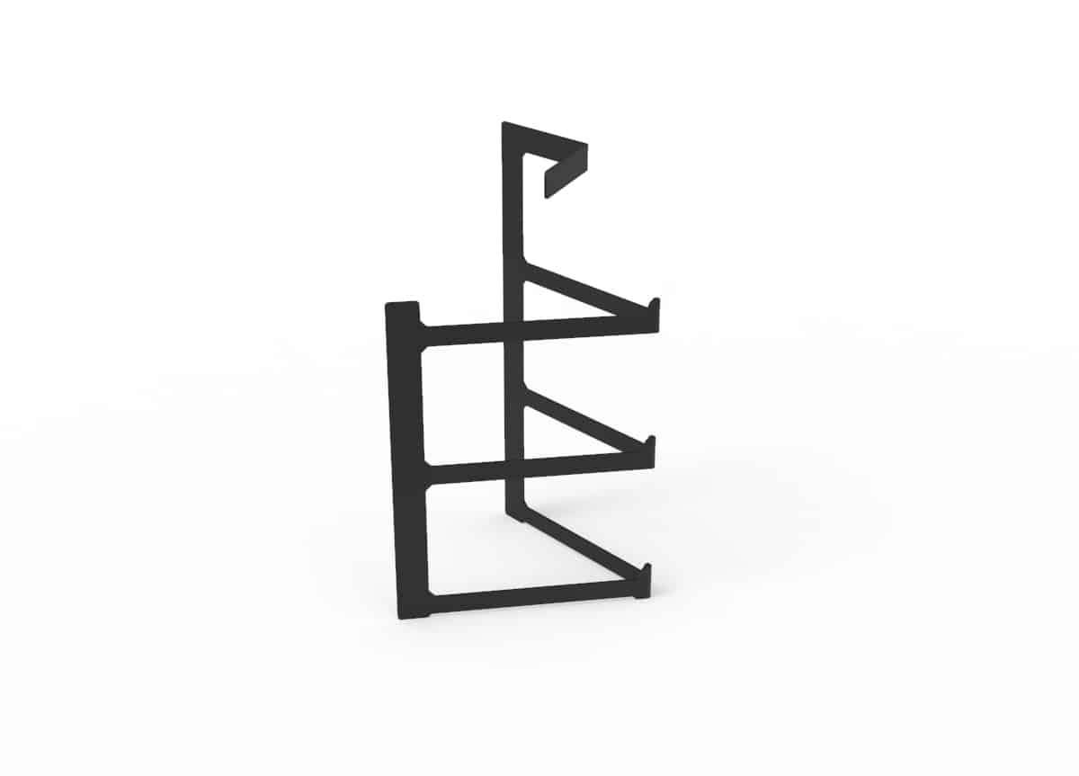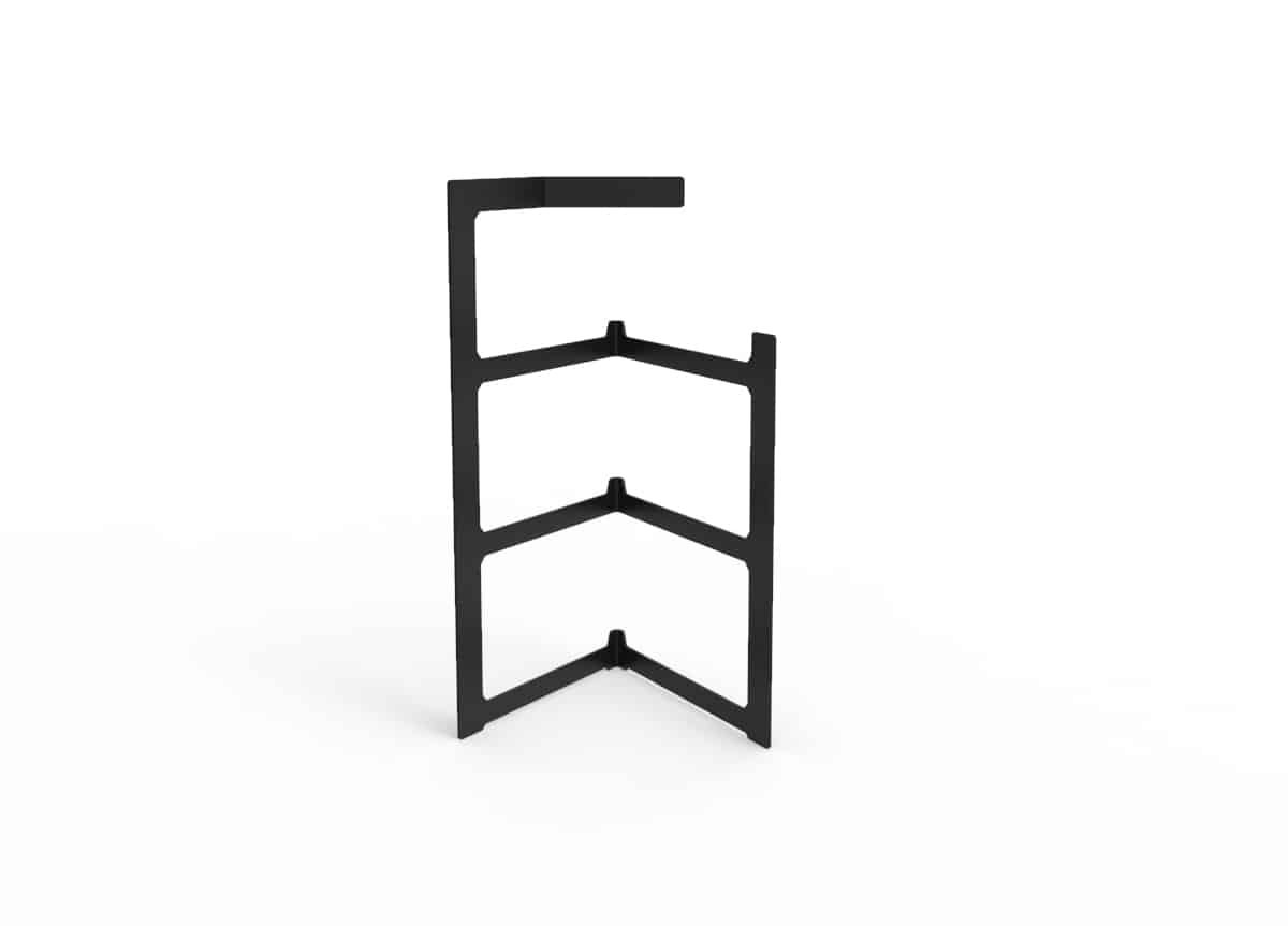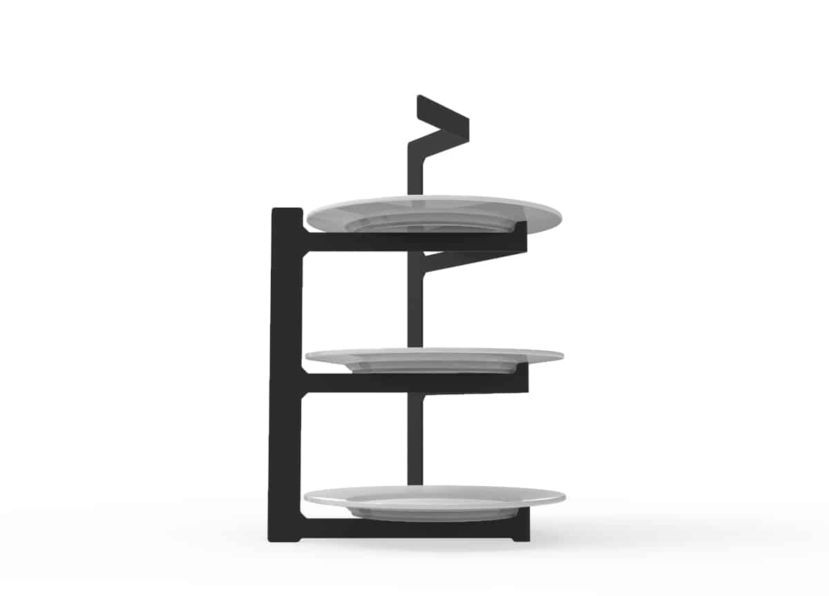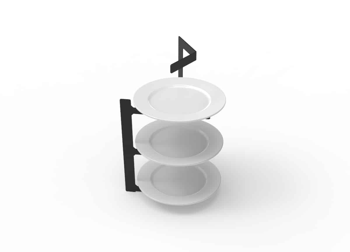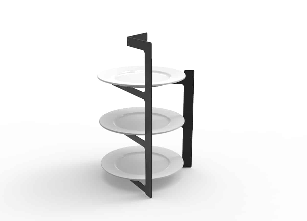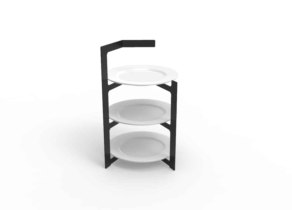 Estructura en acero pensada para platos de postre (19 cm). Puede ir cualquier que tengas o te guste, pero te recomendamos este: https://www.ajidesign.net/product/plato-postre-porcelana-19/